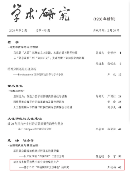 《学术研究》2026年第2期刊发笔趣阁下载 王德福教授学术文章《政务服务便民热线中的公共价值再生产——基于D市“幸福家园阳光议事会”的研究》。